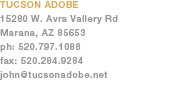 ![]() ![]() Providing the Southwest with the best adobe material and service available. Tucson Adobe will meet all the needs of your adobe project. Experience with all types of adobe: Historical Unstabilized Stabilized: asphalt, cement, & others Colors: find at www.daviscolors.com Experience with adobe design and construction. Expert service for your adobe project. Professional design and construction sources. ![]()